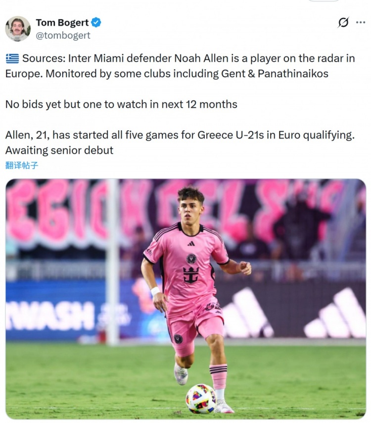 Tom Bogert透露,一些欧洲俱乐部关注迈阿密国际后卫阿伦,其中包括根特和帕纳辛纳科斯。